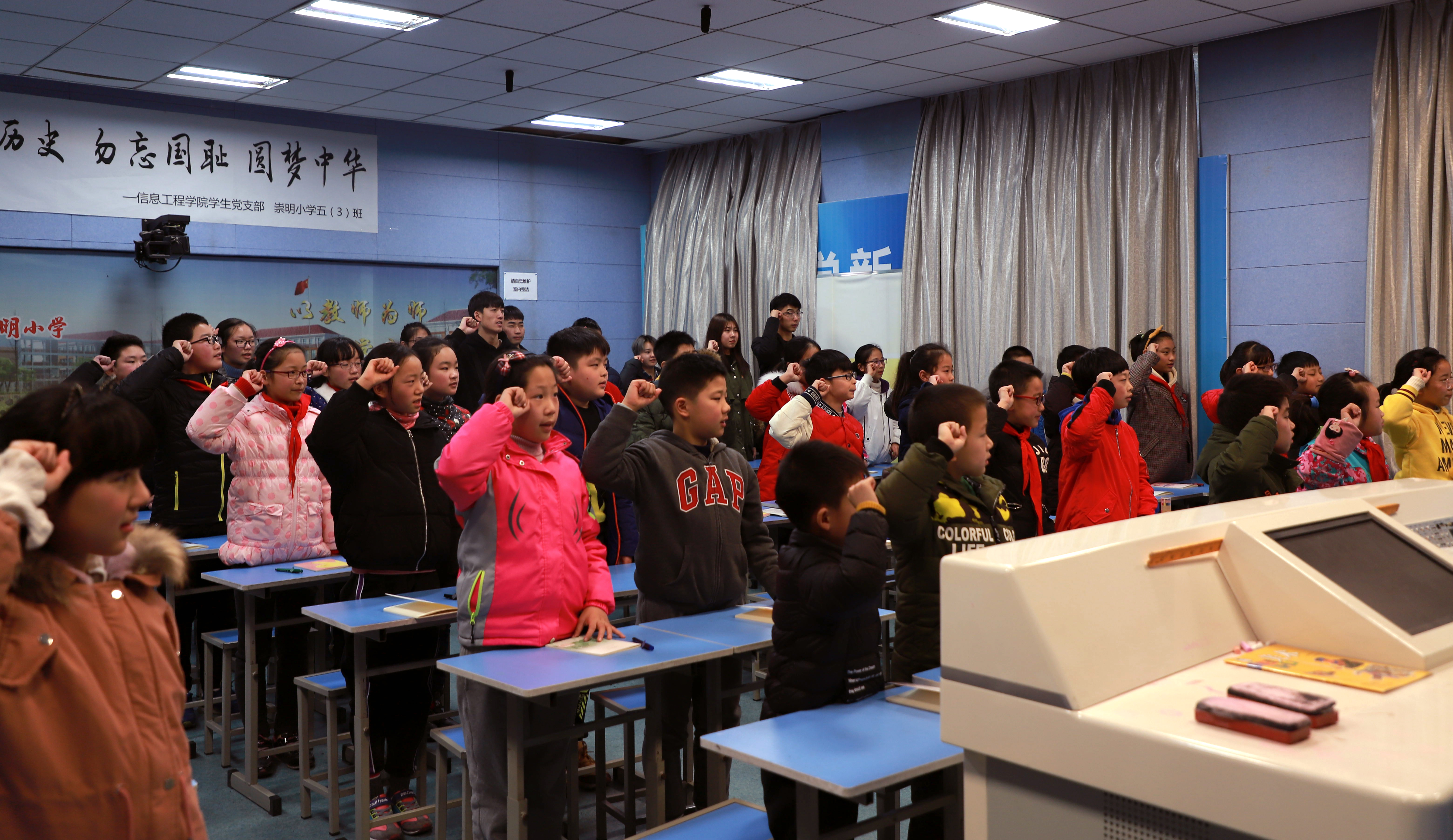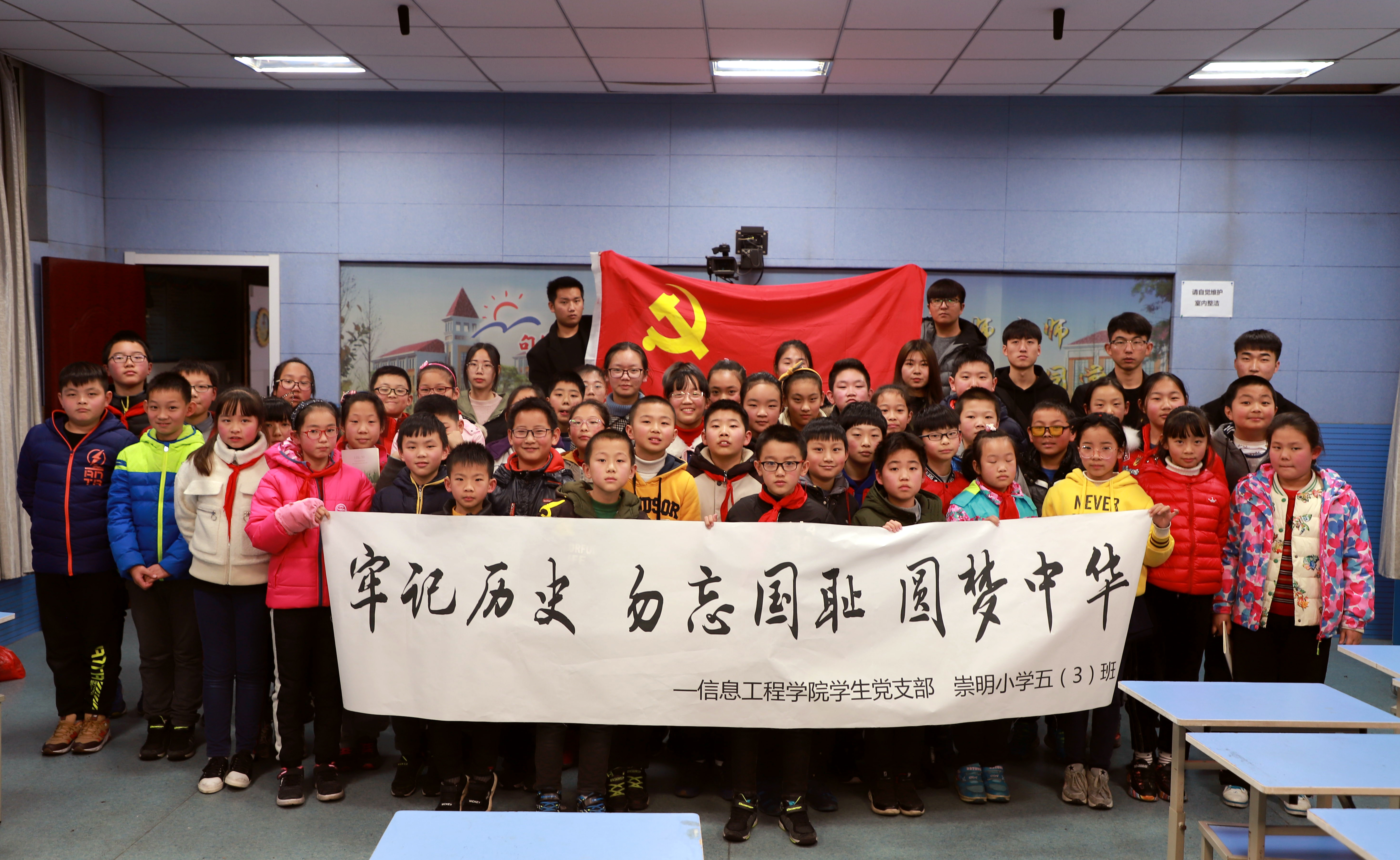 学生党支部组织3名教师党员和14名入党积极分子赴句容市崇明小学开展主题为“牢记历史、勿忘国耻、圆梦中华”国家公祭日主题党日活动,崇明小学46名师生参加了此次活动。活动以缅怀为主线,分为班会讲历史、宣誓明己志、心语寄哀思、白鹤祈和平四个环节。通过主题班会课,支部先进青年向少先队员讲述了南京大屠杀的惨痛历史,希望同学们要牢记历史,勿忘国耻。班会结束后,同学们誓言要做有理想、有担当、有目标的新时代少先队员。活动中,青年大学生与少先队员一起写下对先烈的敬意,将哀思一同叠进千纸鹤。一撇一捺写下的是对和平的珍惜,丝线相连的千纸鹤承载的是同学们对遇难同胞的哀悼。