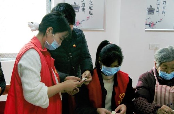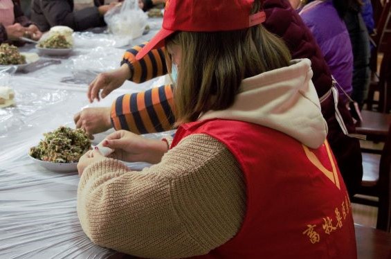 活动中,志愿者们认真学习包饺子,亲手将这些裹着温情和心意的饺子送给社区的老人们,献上了一份温暖的冬至祝福。