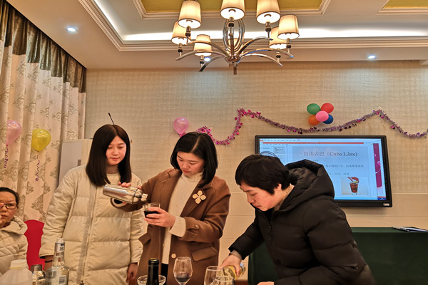 座谈会结束后,大家移步调酒实训室一边学习如何调酒一边面对面地交流心得,女同胞们欢声笑语,沉浸在幸福喜悦的节日氛围中。