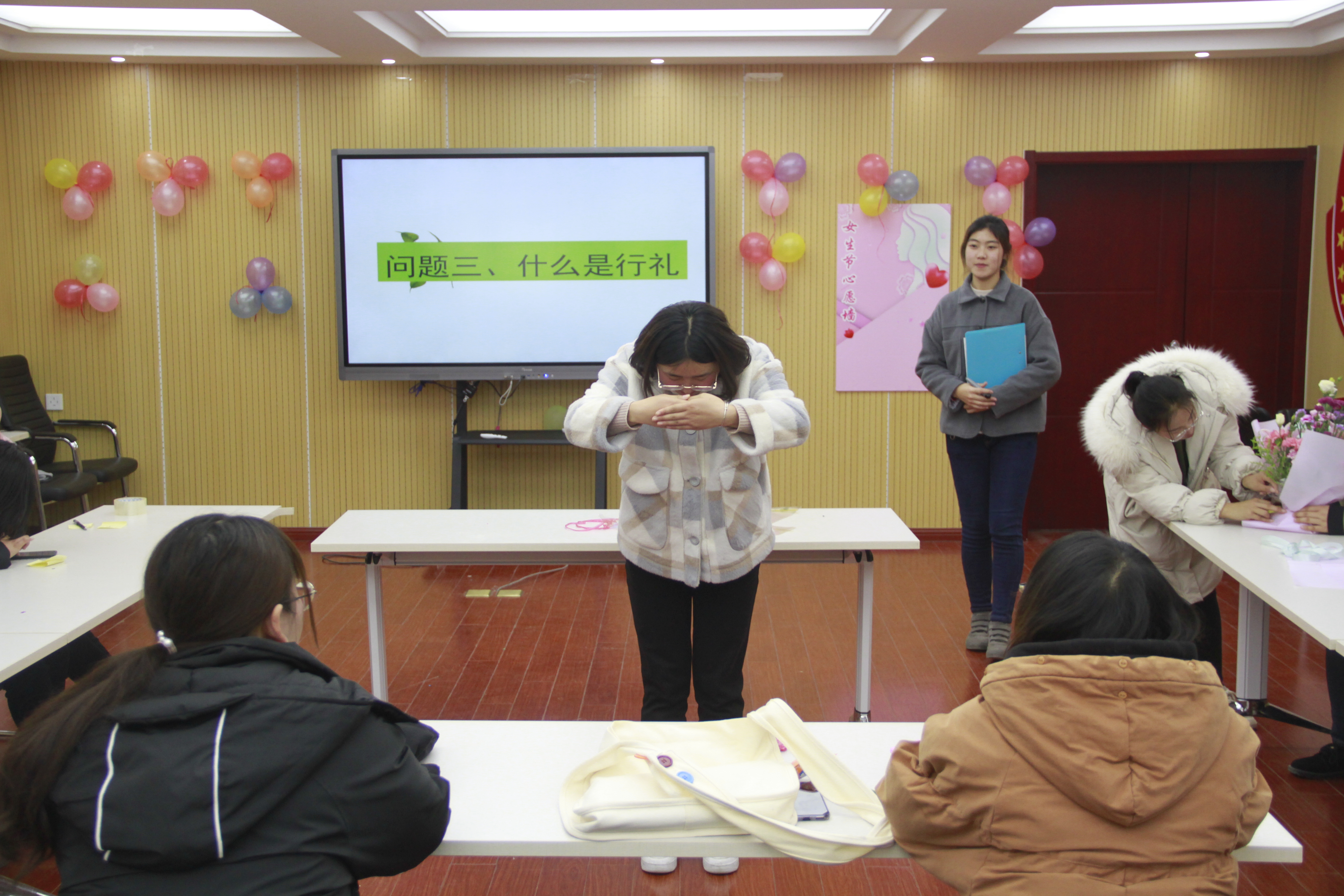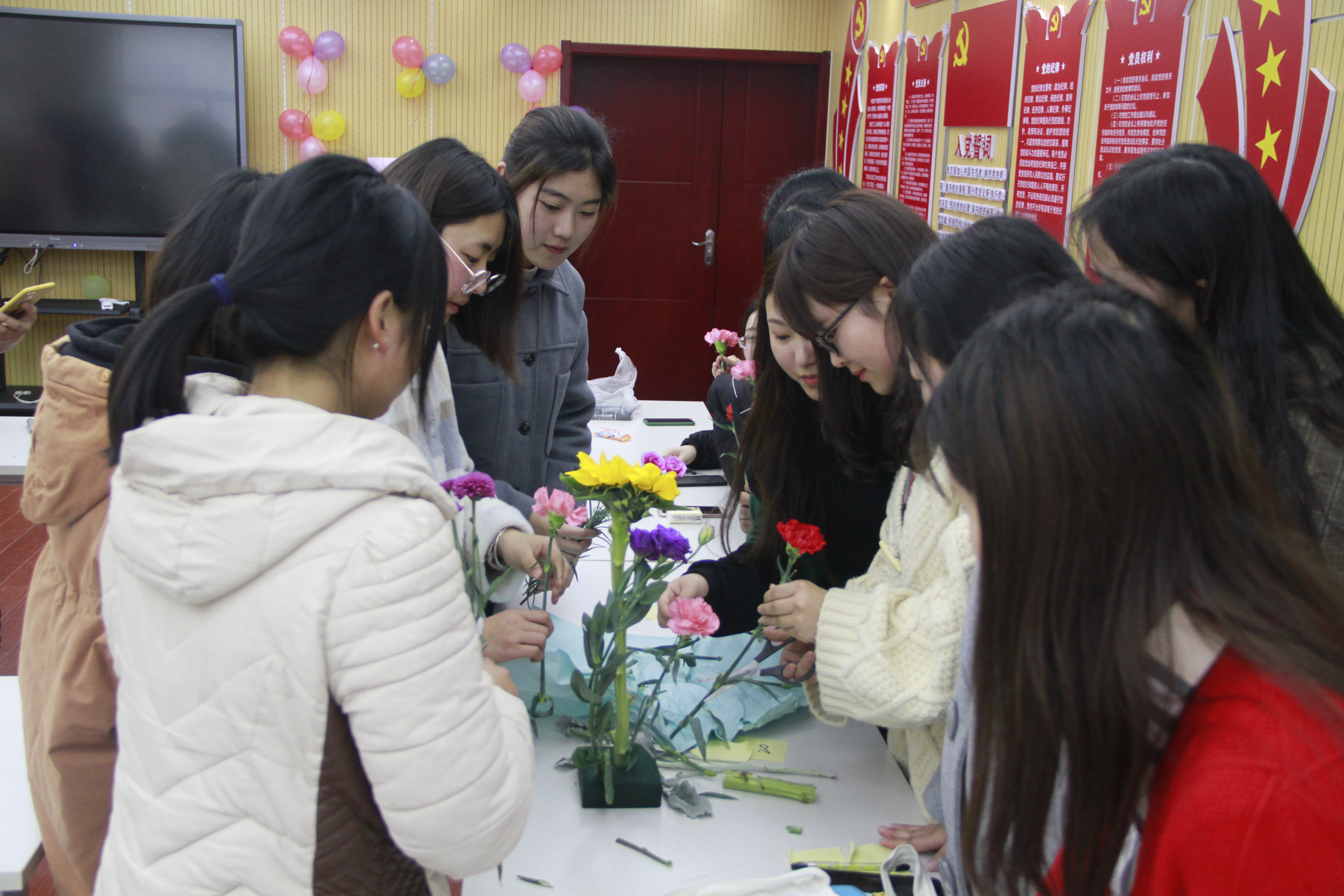 活动分为“礼乐中华”、“铿锵玫瑰”、“蕙质兰心”、“少女祈祷”四个篇章,女生们通过学习立容、坐容、正规礼拜、迎宾、行礼等中国古代女子礼仪,感受传统礼仪之美;通过PPT介绍张爱玲、三毛等新时代女性事迹,学习她们坚持自我,追求自由的精神。插花环节,女生们分成若干小组,精心准备和构思设计,将各种花草进行组合,让它们变得更加赏心悦目。活动最后,大家在女生节心愿墙上写下了对学习与生活的愿望。