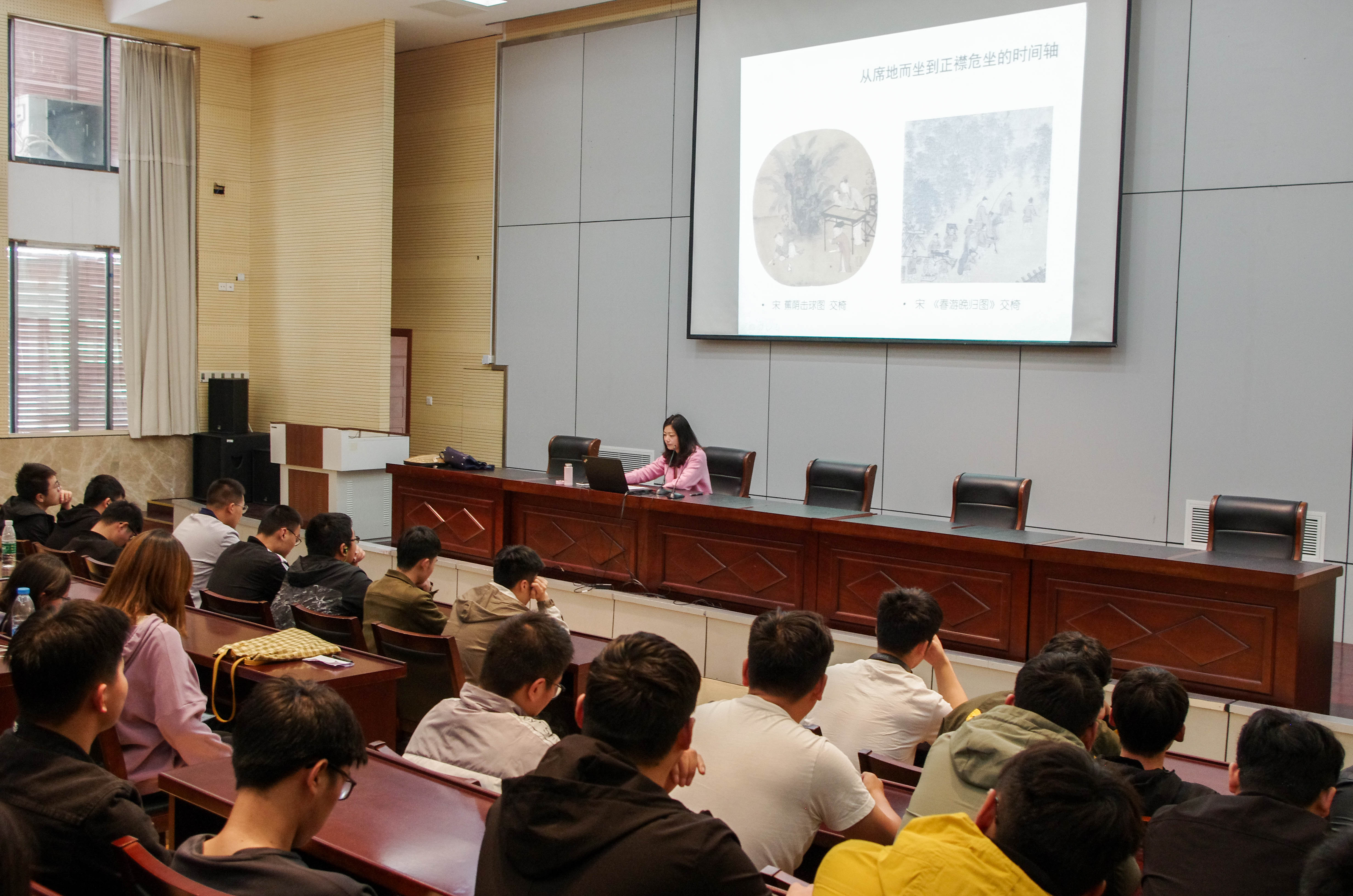 的刘雯佳教授主讲“从席地而坐到正襟危坐”传统家具文化演变,相关专业学生到场听讲。