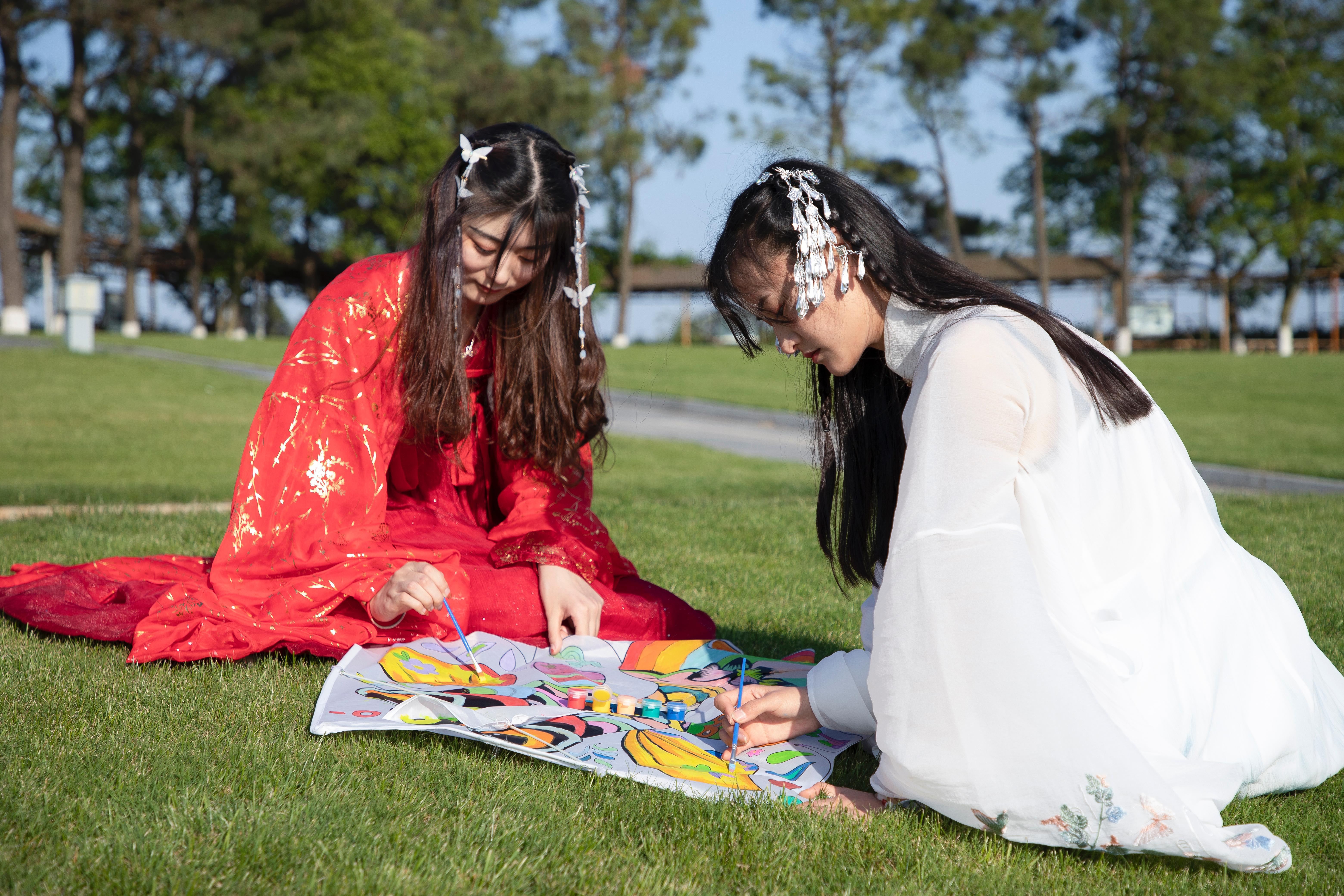 团委组织50名学生穿上传统特色服装,走进江苏省茶博园,抓住春天的“尾巴”,礼茶,画鸢,品谷雨,看万物生长,感受和声自然。