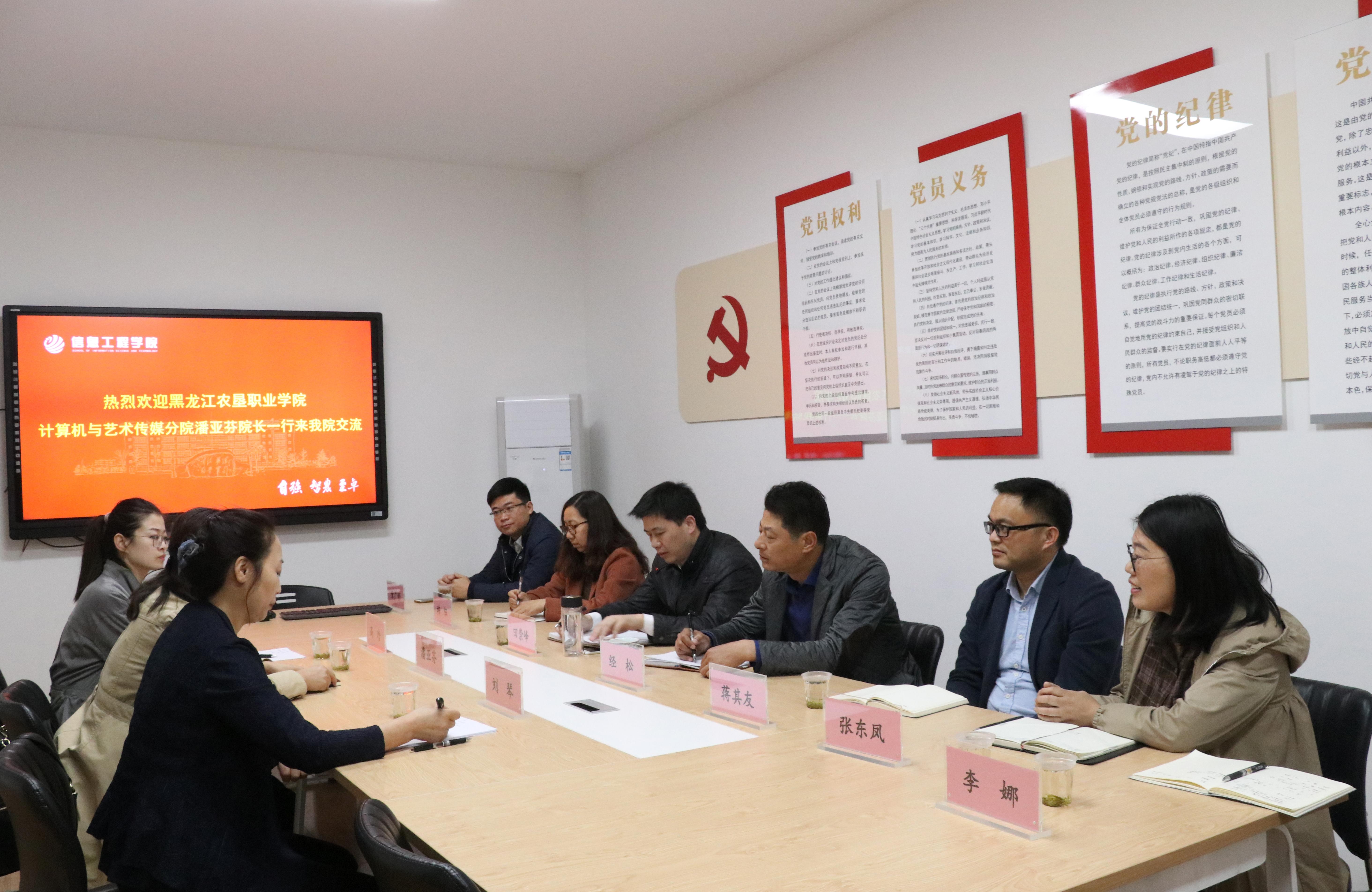 4月26上午,黑龙江农垦职业色花堂 计算机与艺术传媒分院潘亚芬院长一行三人来信息工程色花堂 调研交流,该院相关负责人和专业教师参加了座谈会。