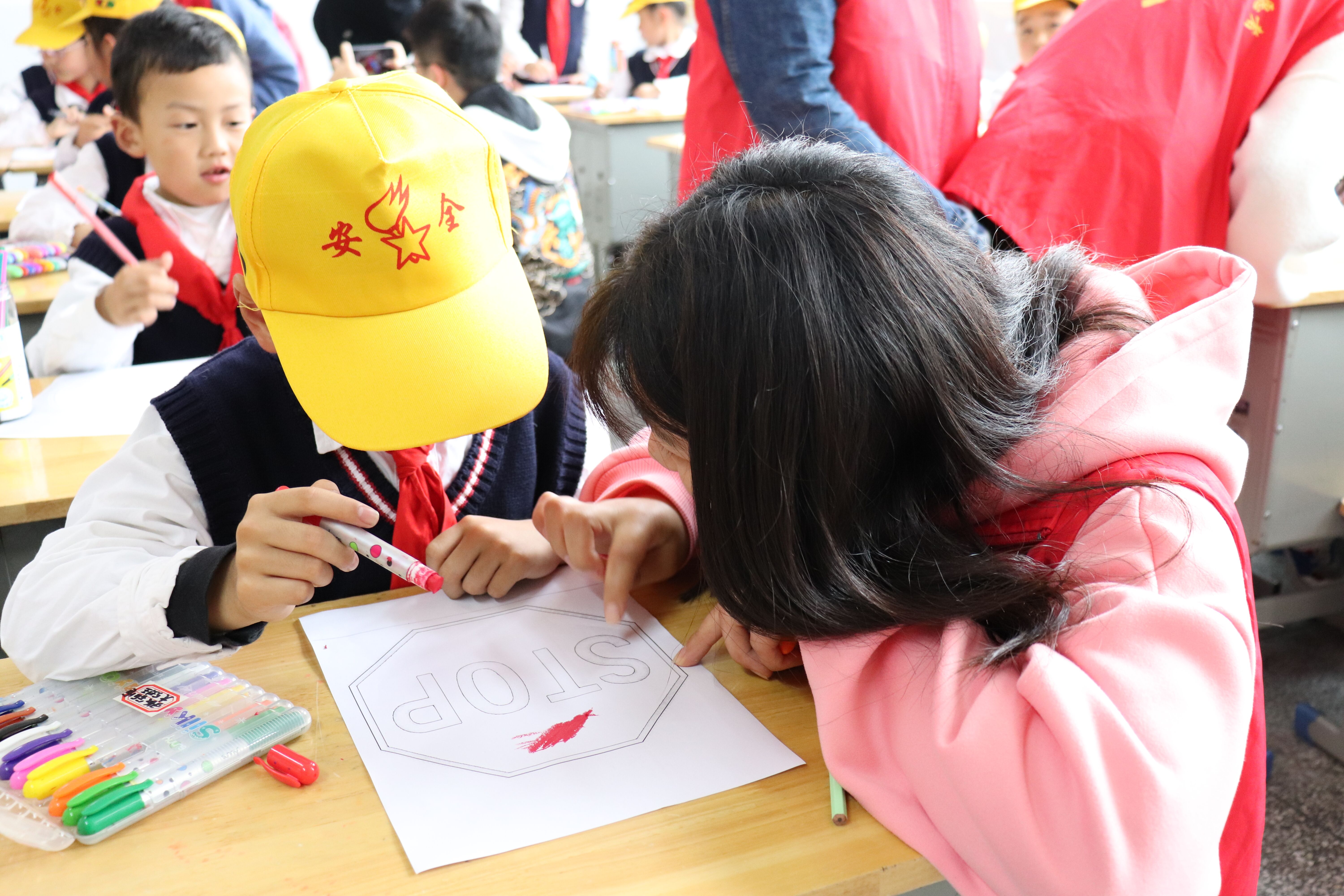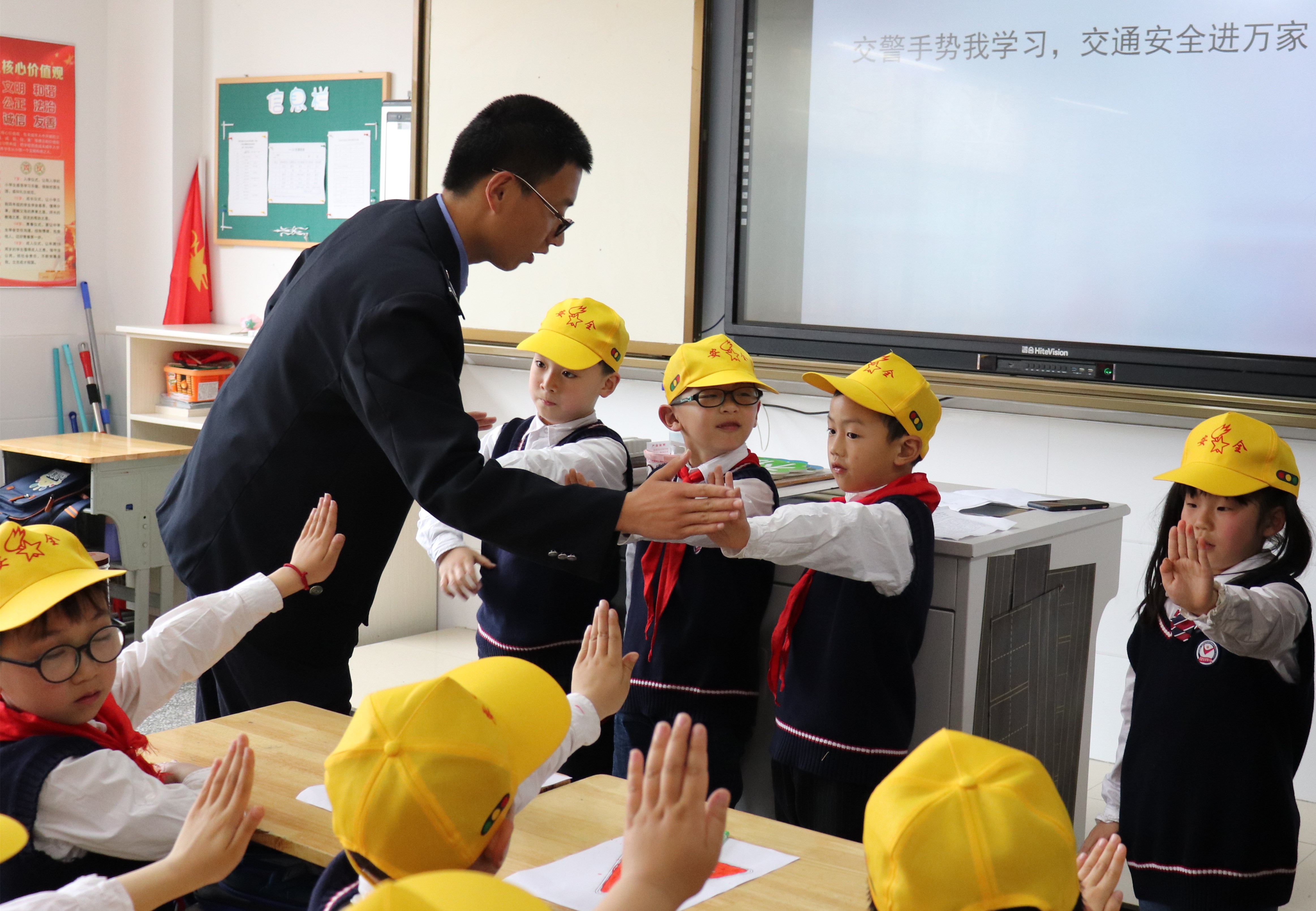 活动中,志愿者们给小学生们发放小黄帽,唤起交通安全意识,为小学生出行提供安全保障;利用PPT、漫画等形式讲解如何安全过马路、不在汽车盲区逗留玩耍、不在马路上嬉戏打闹等交通安全知识,激起了孩子浓厚的学习兴趣。志愿者还和孩子们一起为交通标识涂色,学习交通安全标识。随后,孩子们化身小小交通指挥员,跟随志愿者体验学习直行、停止、左转弯、右转弯、靠边停等简单的交通指挥手势。活动最后,大家一起齐诵交通安全儿歌,进一步加强遵守交通,爱护生命的意识。