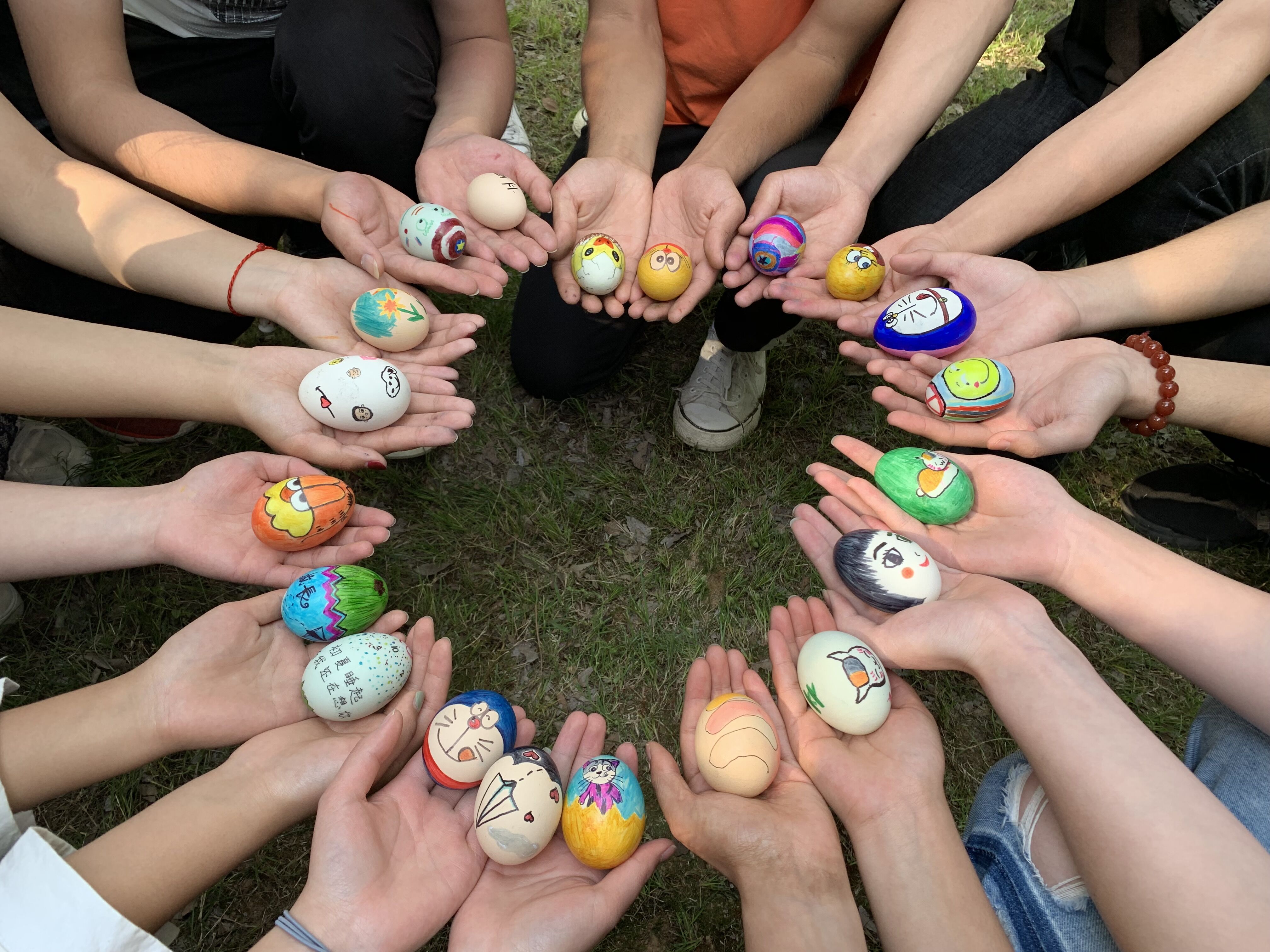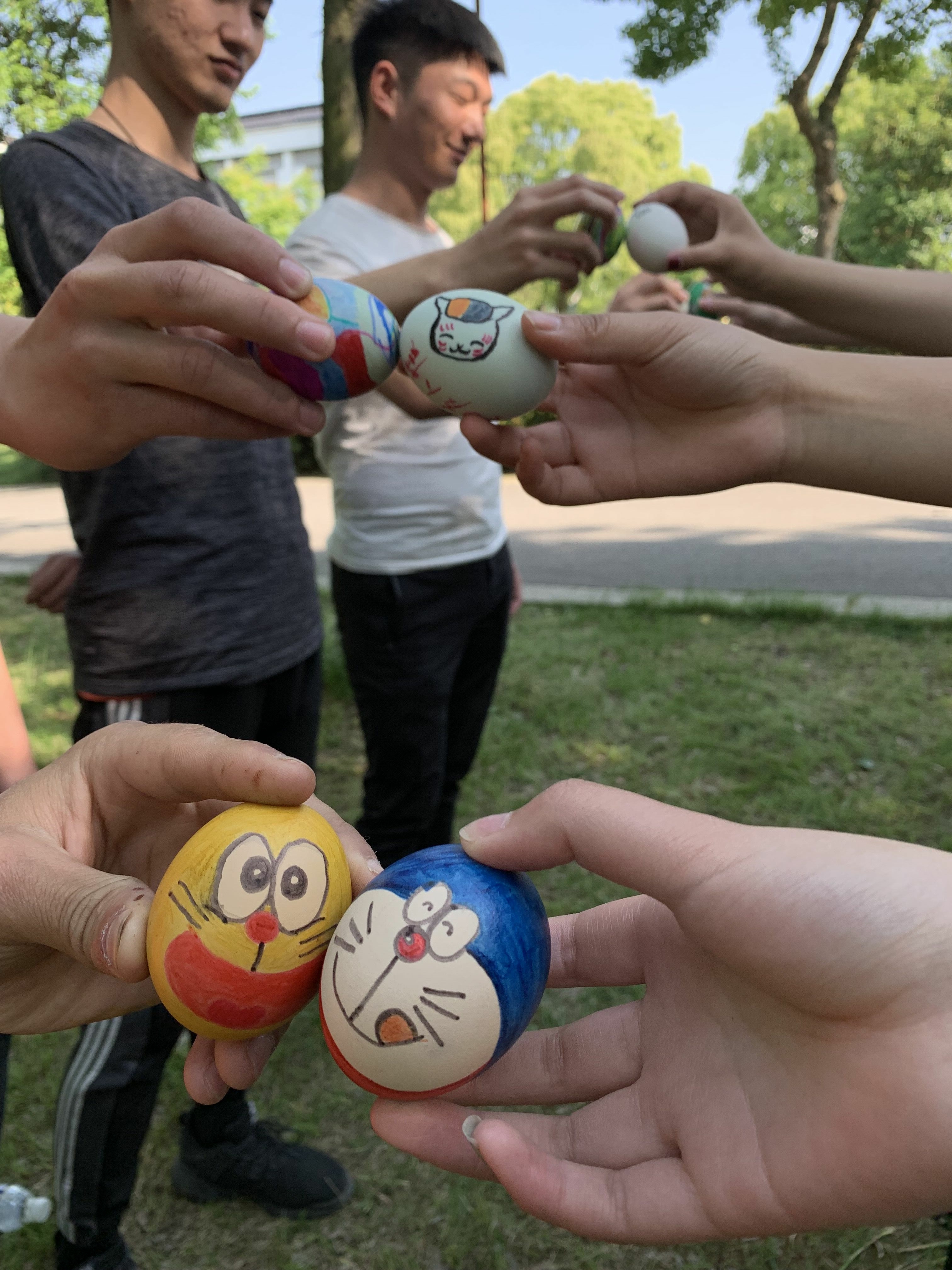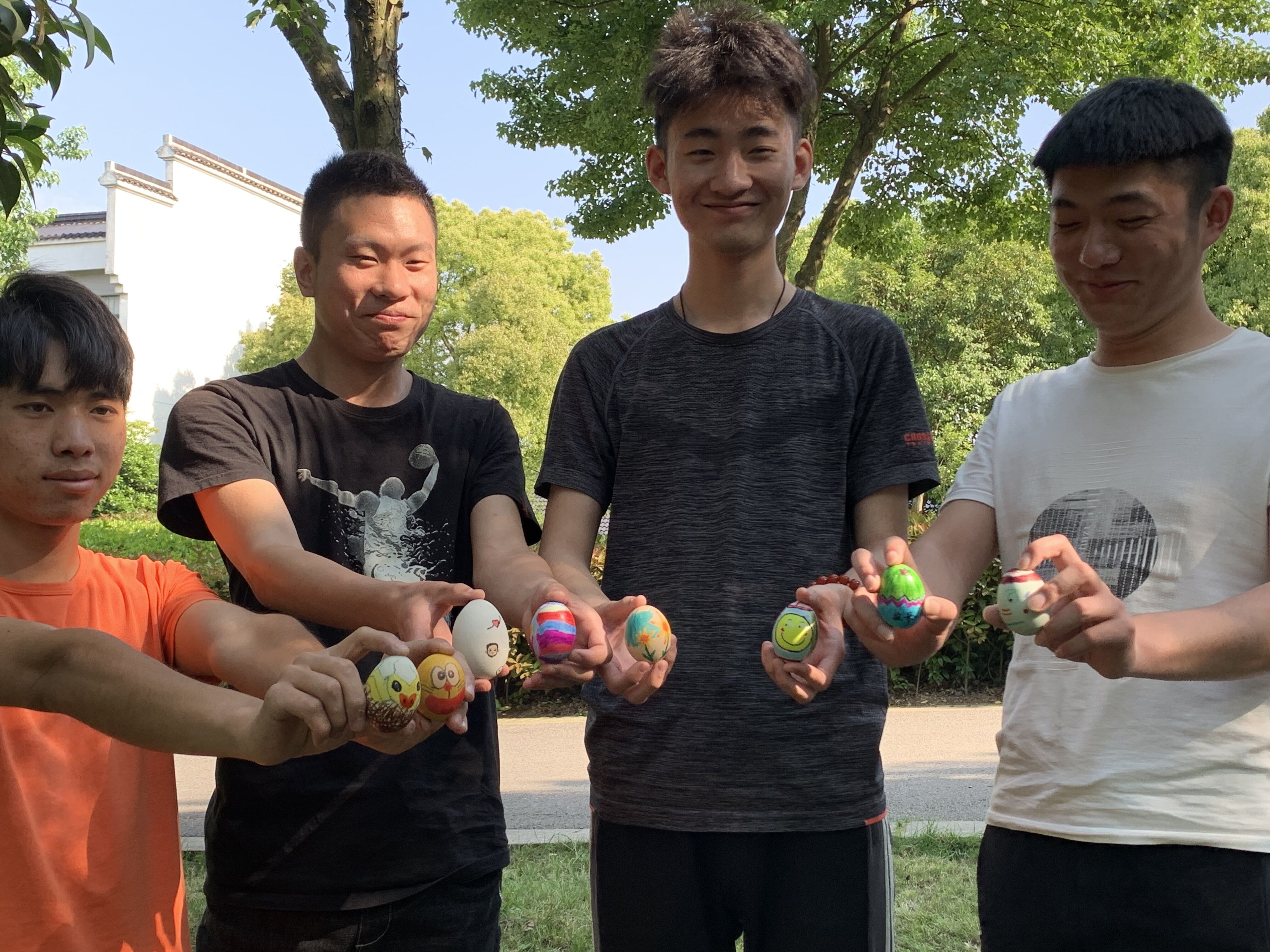 斗蛋之前,同学们拿出画笔,将自己的“斗士”精心“打扮”了一番,女同学们在蛋上画上愤怒的小鸟,机器猫等童年的动画角色,生动可爱。男同学们则画上纸飞机、勇士等图案,寄托了对童年美好的回忆。同学们将自己必胜的信念画在蛋上,蛋头对蛋头,蛋尾对蛋尾,相撞后破壳的蛋就被吃掉,最后完好无损胜出的就是“蛋王”。同学们用彩色丝线编成五颜六色的网兜,将“蛋王”装在网兜里,挂在枝繁叶茂的老树上,寓意生生不息的希望。