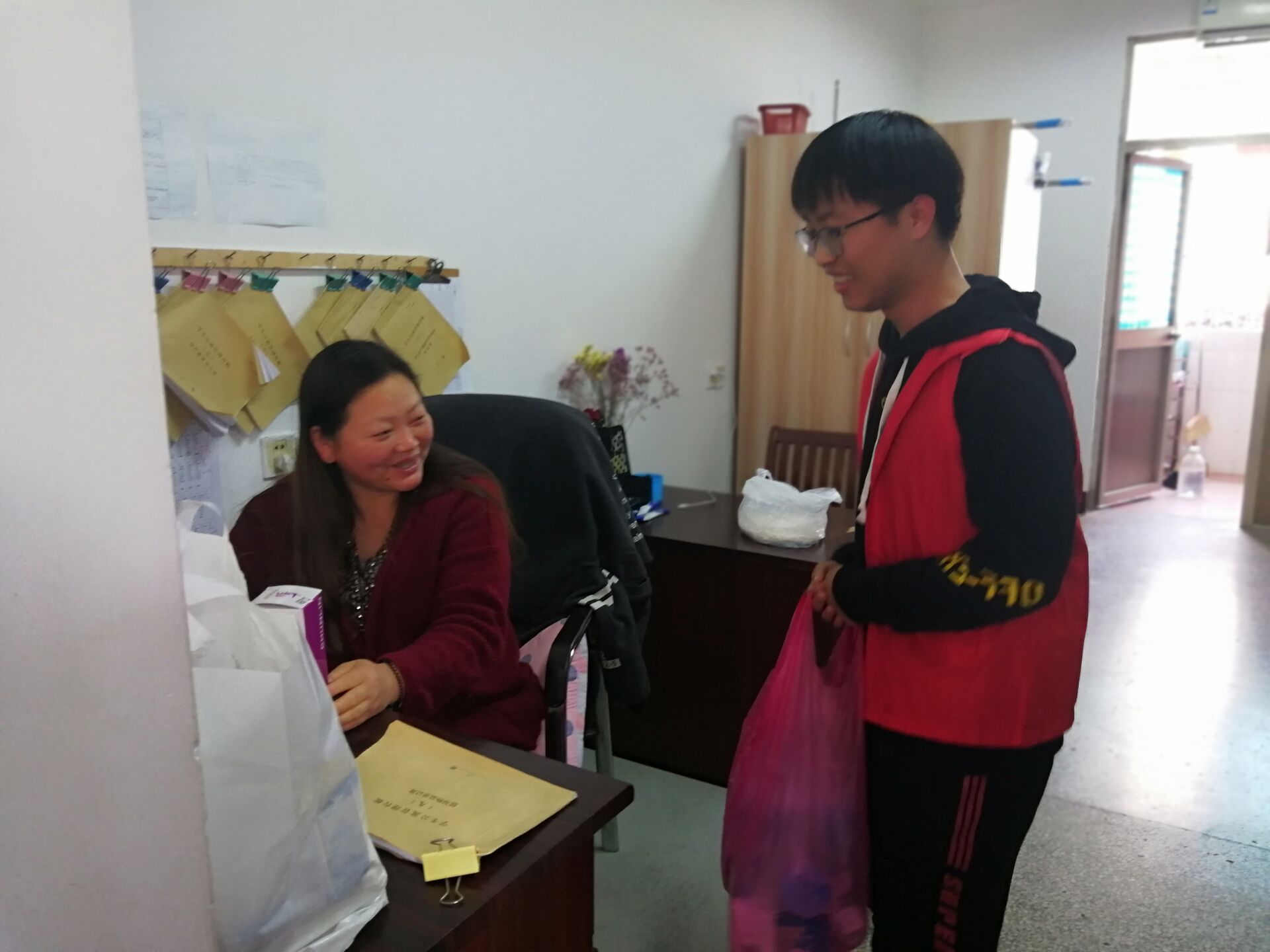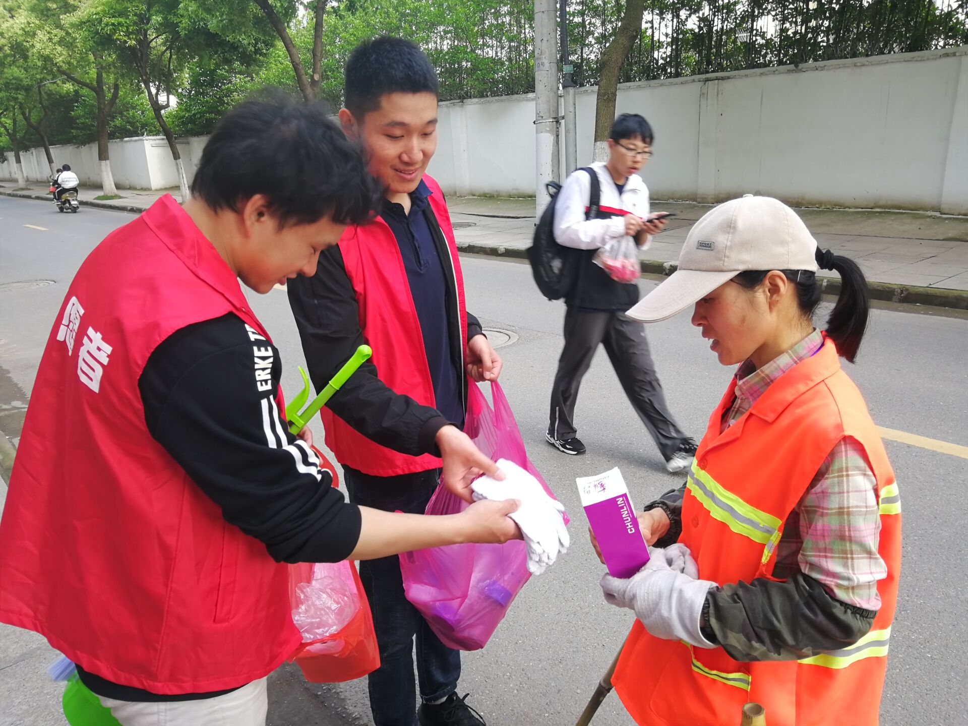 活动中,志愿者们分别来到色花堂 宿舍、食堂、校门,给宿管阿姨、食堂阿姨、保安大叔送上节日的问候以及水杯、口罩、手套等礼物。同学们还走上街头,为“城市美容师”环卫工人带来色花堂 蘑菇、茶叶等产品,感恩他们日常辛勤的劳动,学习他们无私奉献的精神,并在色花堂 内、马路上打扫卫生,受到大家一致好评。