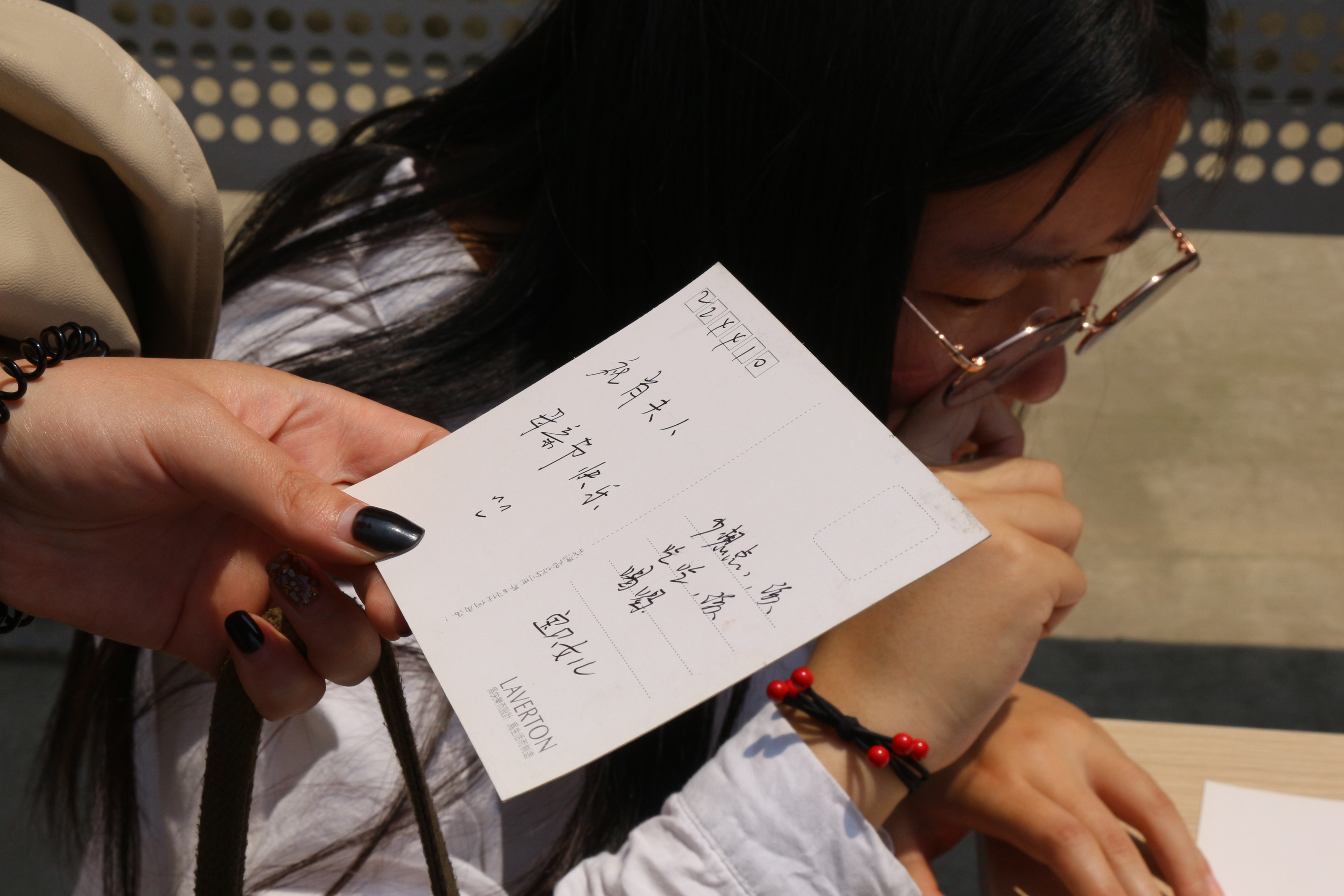 同学们以三行诗形式在明信片上书写着对妈妈的想念,有的拍照之后发给母亲看,有的通过视频读给母亲听,有的直接编辑短信发送给母亲,用实际行动表达对远方母亲的爱意,志愿者们将明信片收好后帮同学邮寄。志愿者们还为色花堂 女教职工献上了一束束准备好的康乃馨鲜花,并致以节日最真挚的问候。最后,同学们在“浓情五月 感恩母亲”条幅上签名,活动圆满落幕。