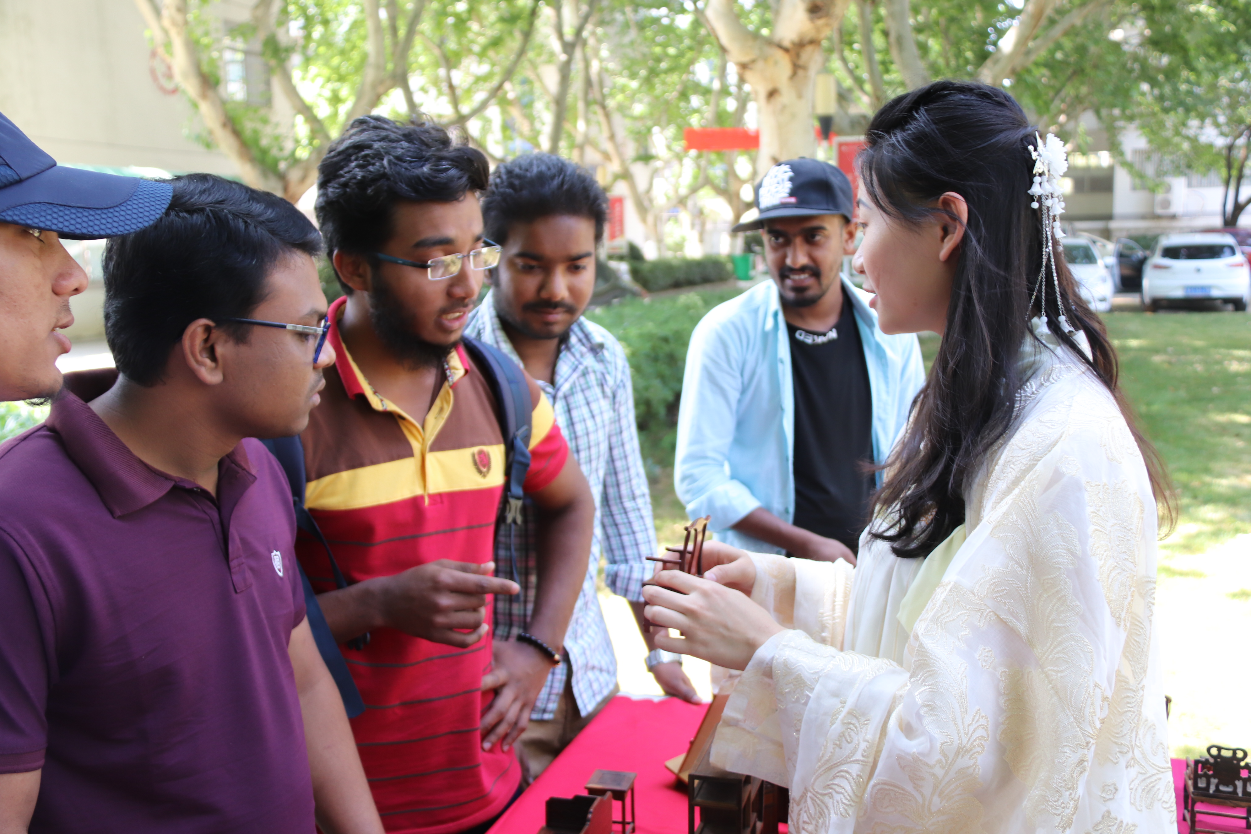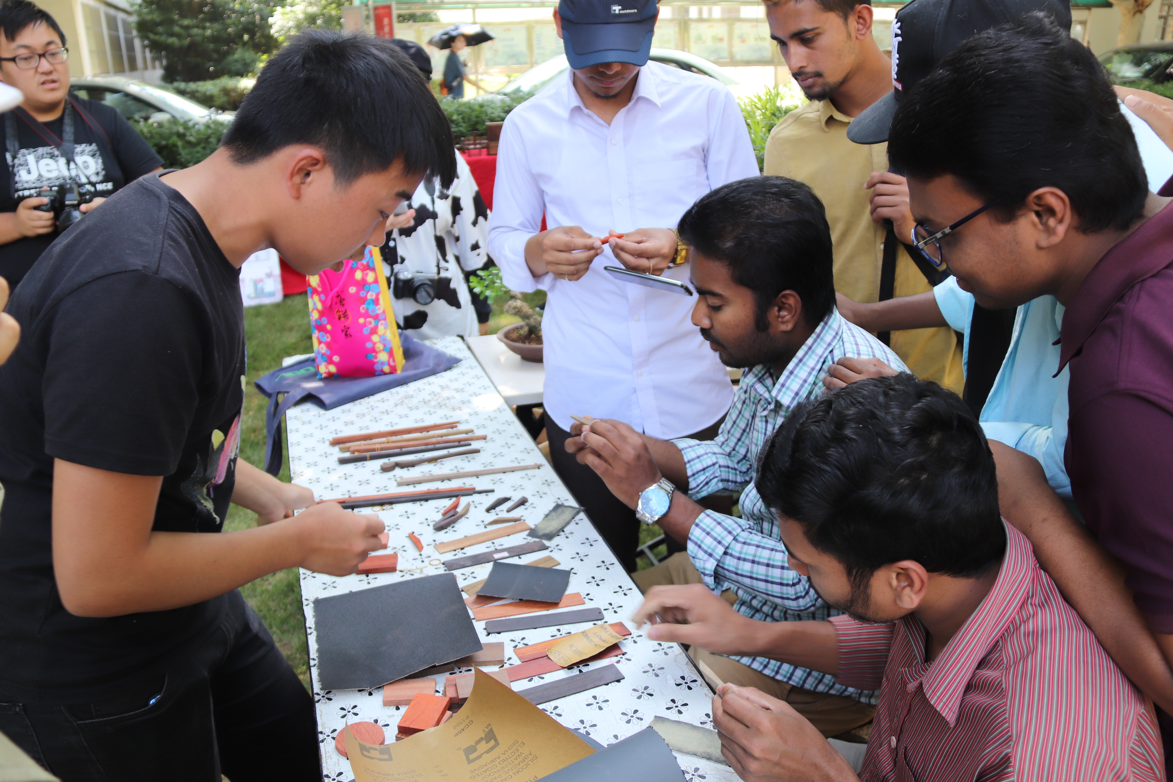 活动在中正式拉开帷幕,身着汉服的家具社团同学为留学生表演了《诗经》、《论语》等传统文化经典著作诵读,并展示了优秀红木手工制品:红木书签、发簪、手镯等。在设置的操作台上,留学生们跃跃欲试,在社团同学的帮助下完成了他们的手作首秀,对中国传统文化有了更加深入的了解。