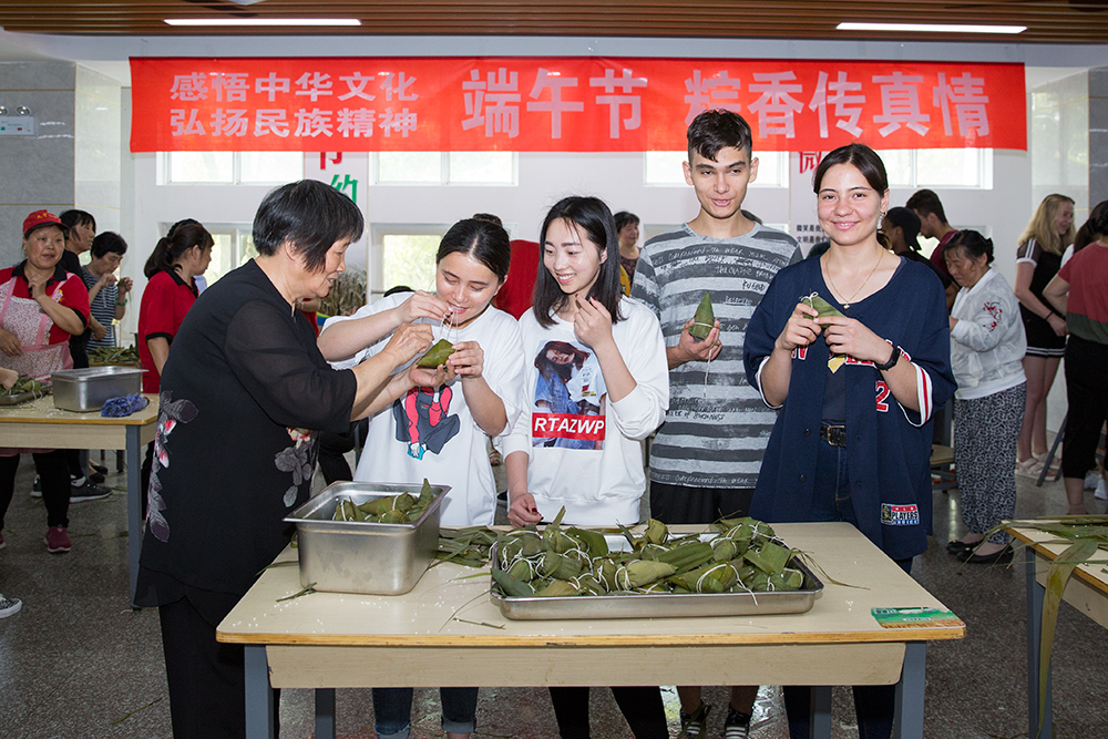 退休老教师手把手教留学生们包粽子,让同学们体会到了包粽子的乐趣。活动中,老教师们一边包粽子一边给留学们讲述中国古代爱国诗人屈原的故事、包粽子的由来、端午节传统习俗等,让留学生们感受到了中国传统节日浓郁的文化气息,感悟到了中国文化的博大精深。活动现场,师生互动,气氛活跃,给大家留下了难忘的印象。