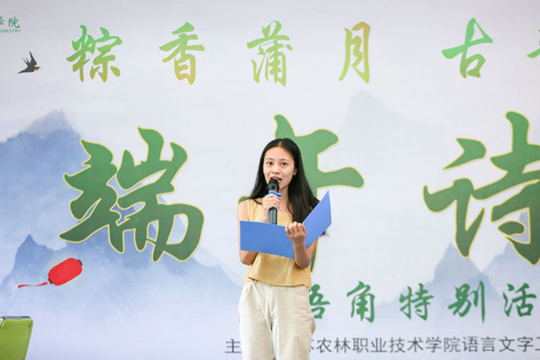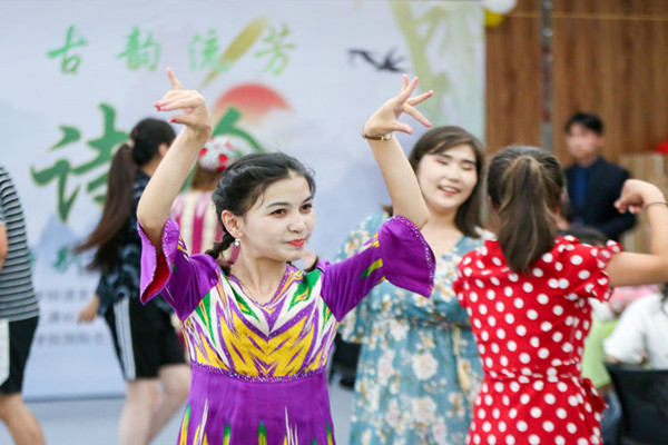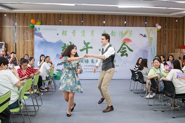活动分为“端午奇缘话习俗”“经典诵读”“风采绝伦”“经典传唱”四个环节。中外学生与老师们一起朗诵、咏唱了《渔父》《将进酒》《雷电颂》《明日歌》和《少年中国说》等经典篇目。来自新西兰的志愿者——罗大佑(OWAIN THOMAS LLOYD DAVIES)即兴演唱了新西兰民谣,质朴淳厚的歌声引来阵阵掌声。维吾尔族舞蹈《夏合娜孜》更让大家眼前一亮,姑娘们身着民族服装,随着动感的节拍摇摆、旋转。在场的同学们被这热闹欢快的氛围所感染,纷纷加入了踏歌起舞的行列,现场气氛高潮迭起。