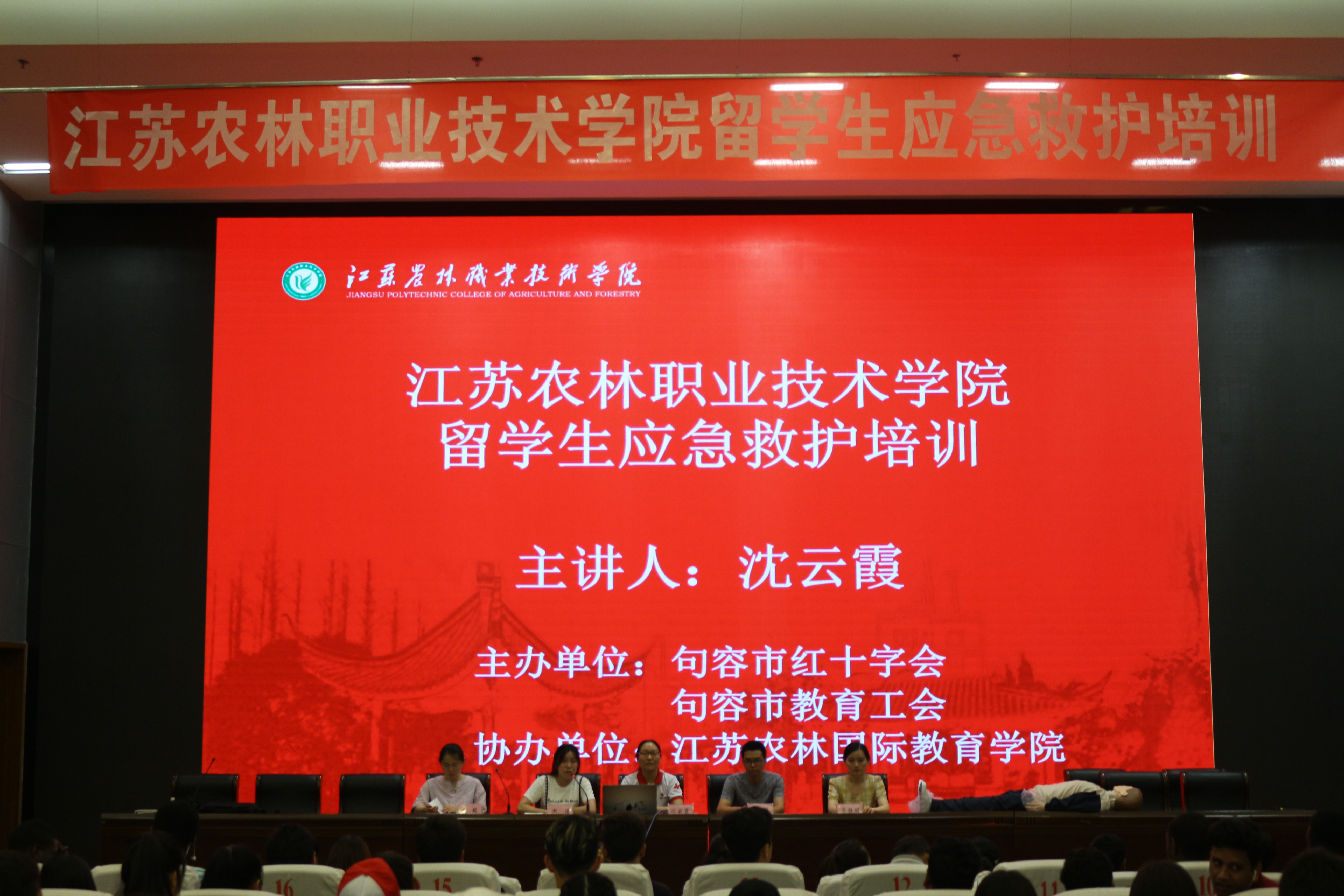 本次培训由句容市红十字会沈云霞主任医师主讲。在培训现场,她运用了理论教学结合实际操作的方式,通过图片、视频等直观地向留学生们讲解了心肺复苏术(CPR)、气道异物梗阻、火灾、踩踏、触电等突发事故的处理方法。留学生们在沈医师的指导下,还演练了心肺复苏术以及气道异物梗阻的应对方法。本次培训不仅给我院留学生普及了自救互救、应急避险的基本技能,也提升了他们应对突发事件和意外伤害事故的实际操作能力。