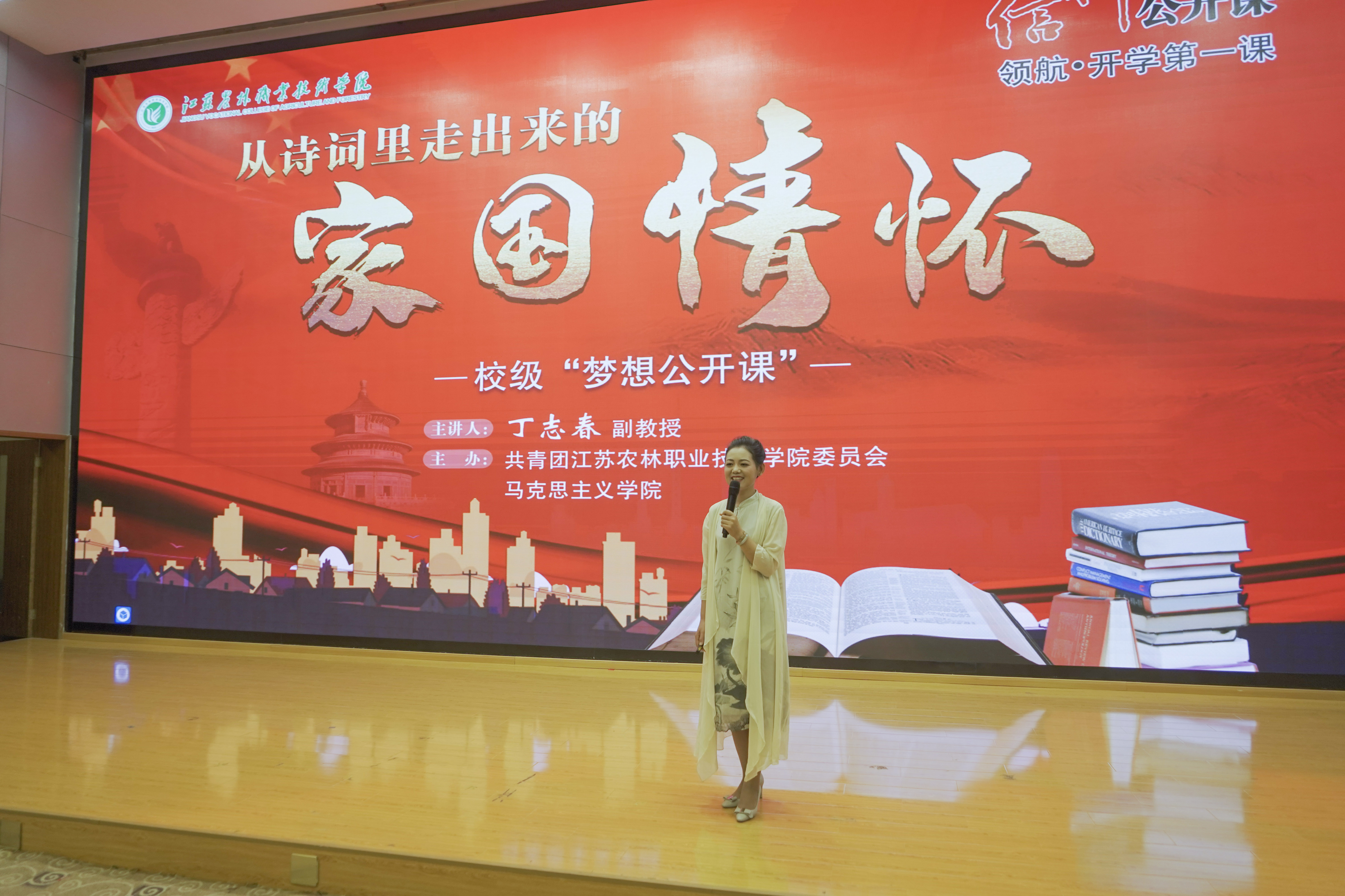 丁志春副教授以“从诗词里走出来的家国情怀”为主题,为团员青年上了“开学第一课”。她以《诗经》中的《黍离》、《击鼓》为切入点,从屈原的爱国情怀讲到唐宋诗人们的爱国诗词,再到以毛泽东同志为代表的中国共产党人的革命诗词,她深入浅出的讲授了一首首气势磅礴的诗词和一段段诗词背后感人至深的故事,深层次的揭示了早已深入国人骨髓、融入文人的血液的家国情怀与时代责任。