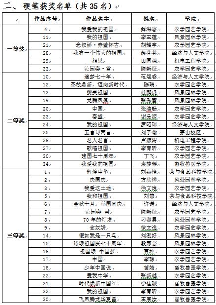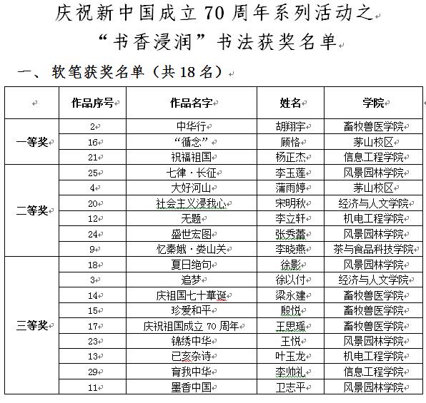 经过评审,胡翔宇、顾恪、杨正杰三位同学的作品获得软笔书法组一等奖;鲜海容等六位同学的作品获得硬笔书法组一等奖。其余奖项也花落各家。