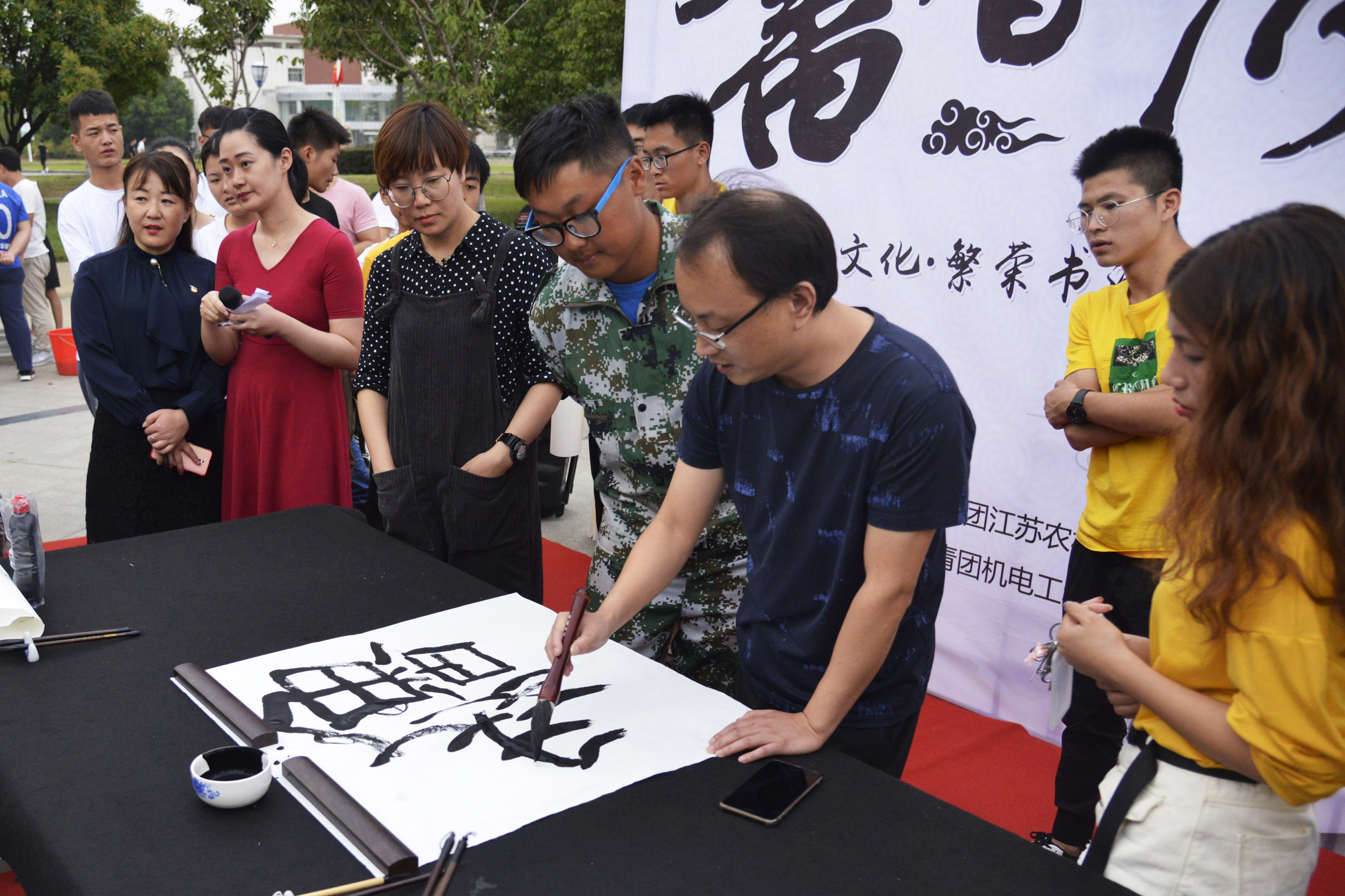 团委承办的“书香浸润”书法大赛在励志广场举办。现场特邀镇江市书法家协会副主席许能俊、句容市九三学社主委林杏芳、句容市书法家协会副秘书长周龙俊、刘清和江苏书法家协会会员丁鹏校友担任比赛评委。