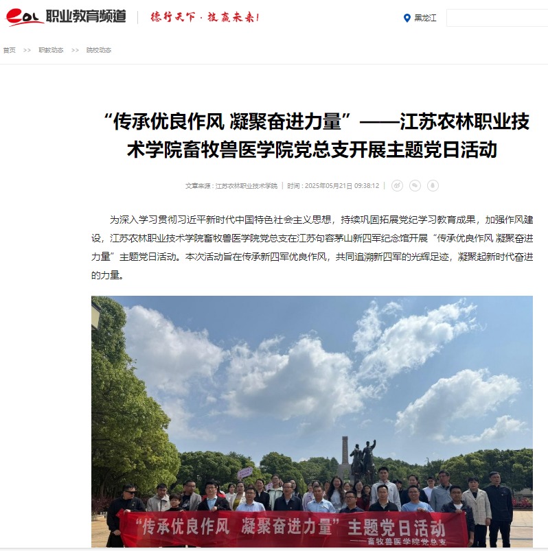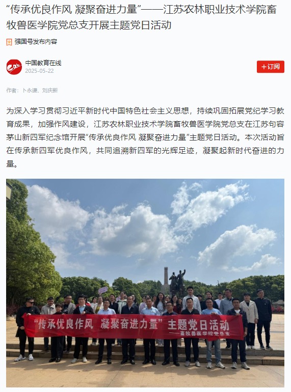 党总支在江苏句容茅山新四军纪念馆开展“传承优良作风 凝聚奋进力量”主题党日活动,得到学习强国强国号、中国教育在线的关注和报道。