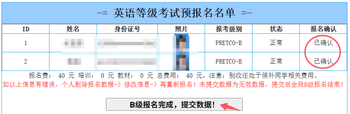 2.班级学委登录网站//bm.sehuatang98.net/,点击集体登录,以班级密码进入,在左栏菜单选择“英语报名数据”确认班级报名名单,有“未确认”者务必及时告知本人登录系统提交确认,待本班所有报考学生完成确认后再点击“B级报名完成,提交数据”,完成本班报名;